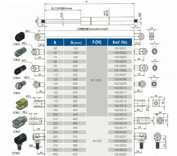 注:由于气弹簧是非标准的,以上仅为型号的一部分。我们可以根据客户的要求定制。